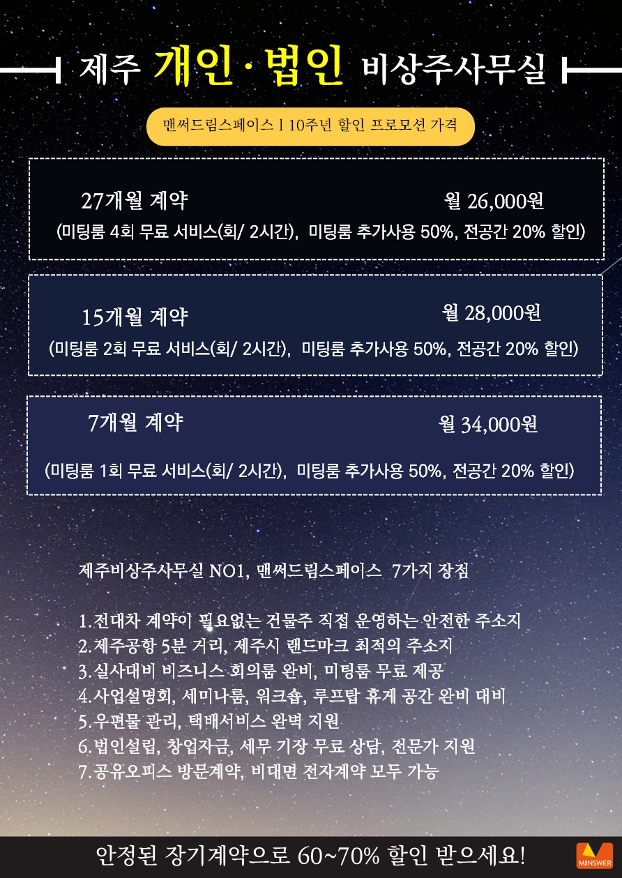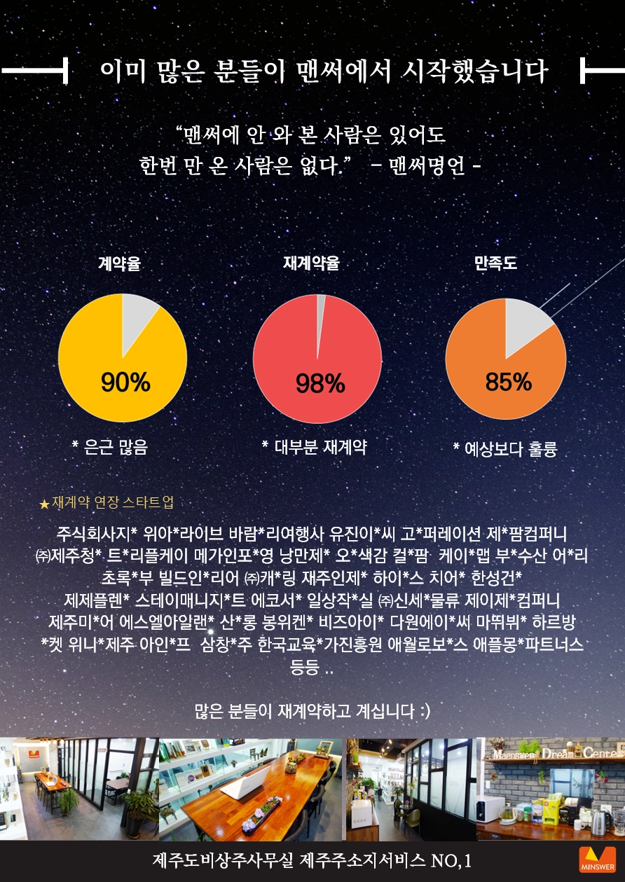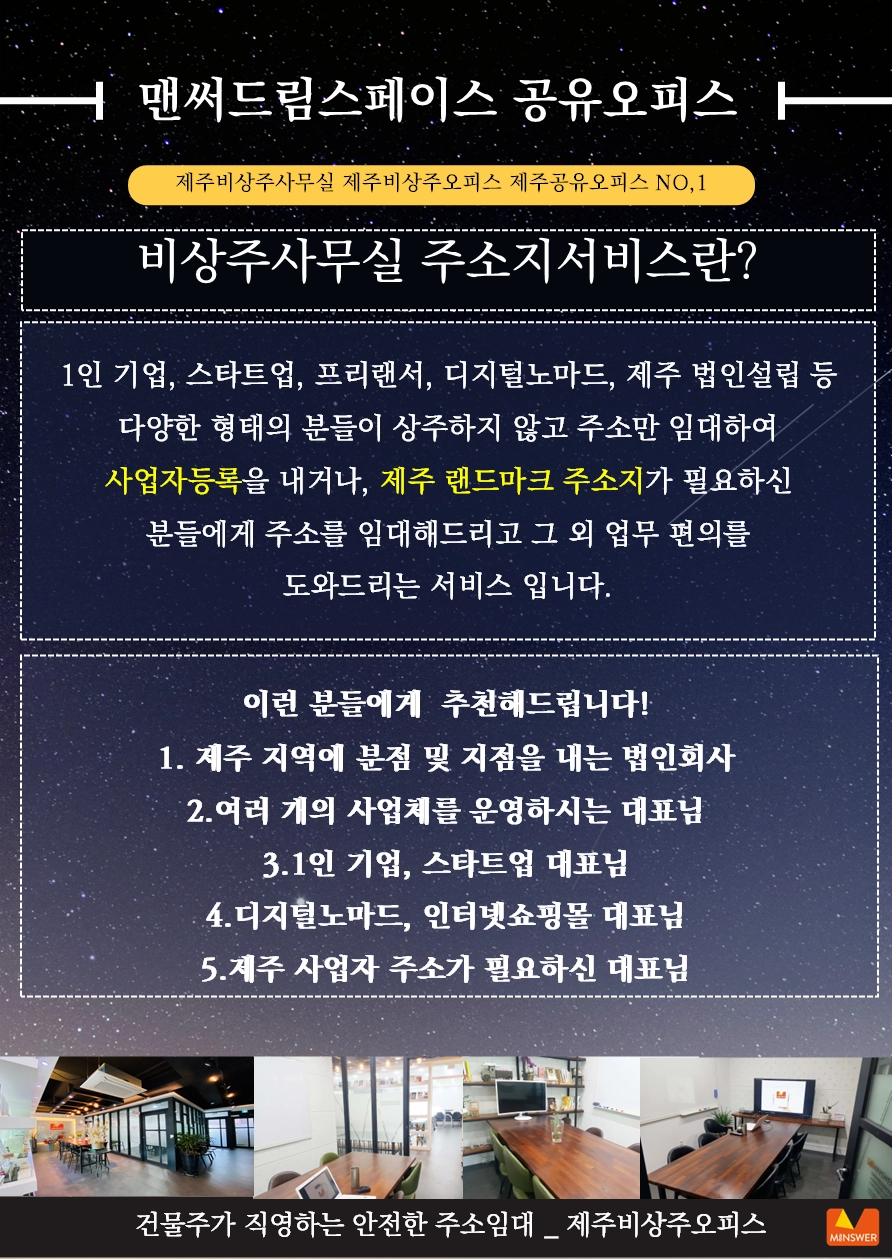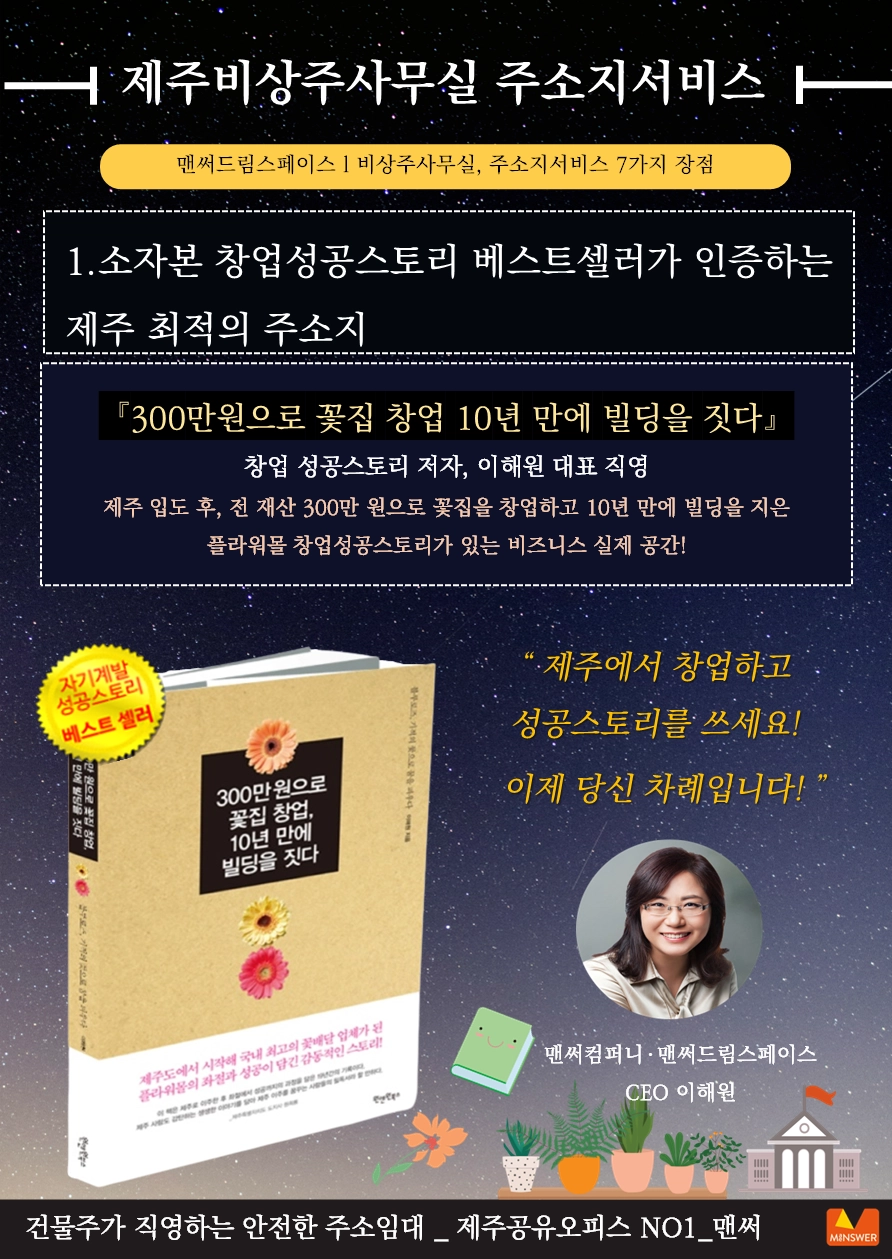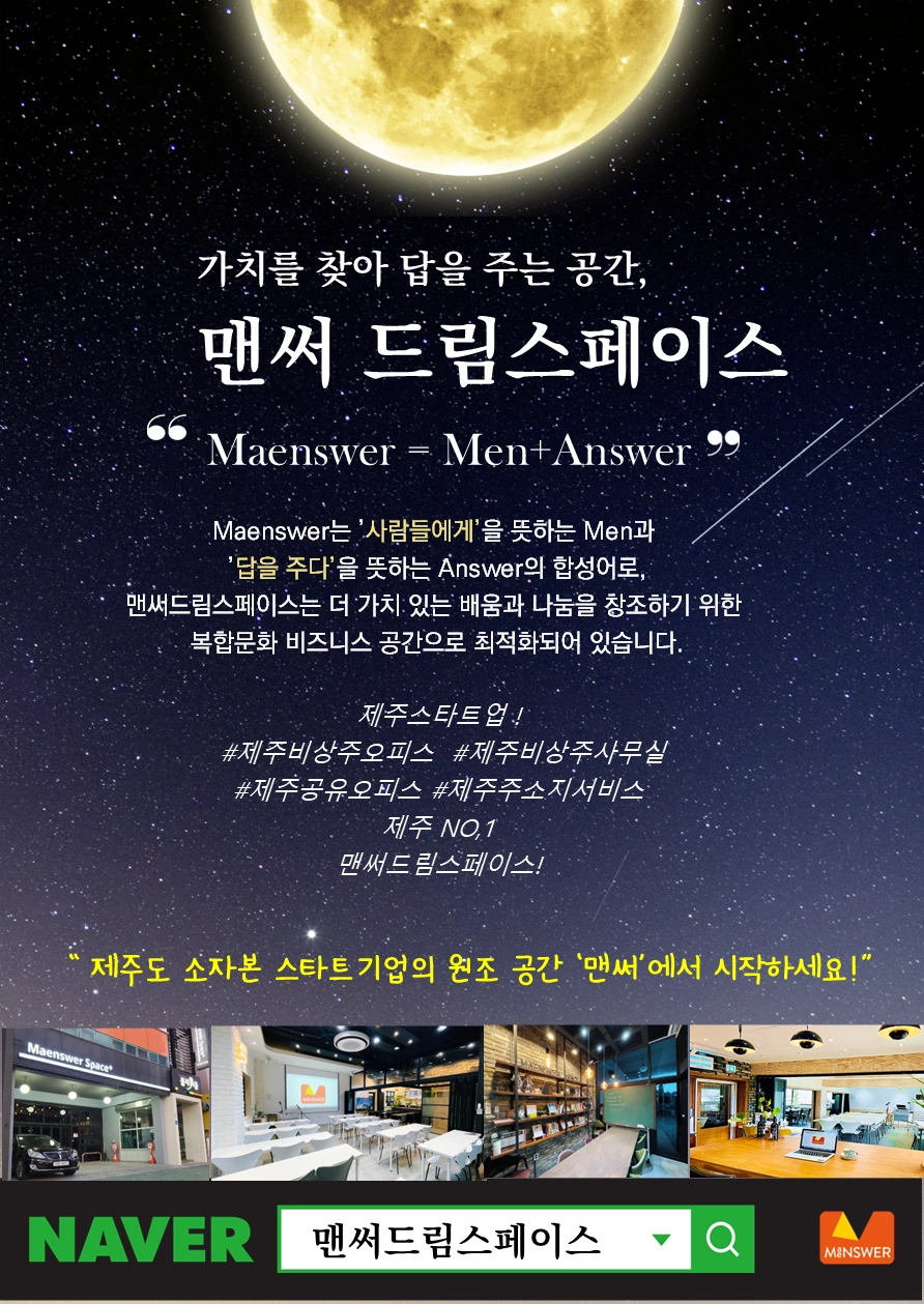 맨써드림스페이스(맨써컴퍼니) | 대표 이해원 | 제주특별자치도 제주시 신대로145, 맨써빌딩 전관 (사무실-4층) | 계좌정보 : 국민 873801-01-327512 이해원(맨써드림스페이스)